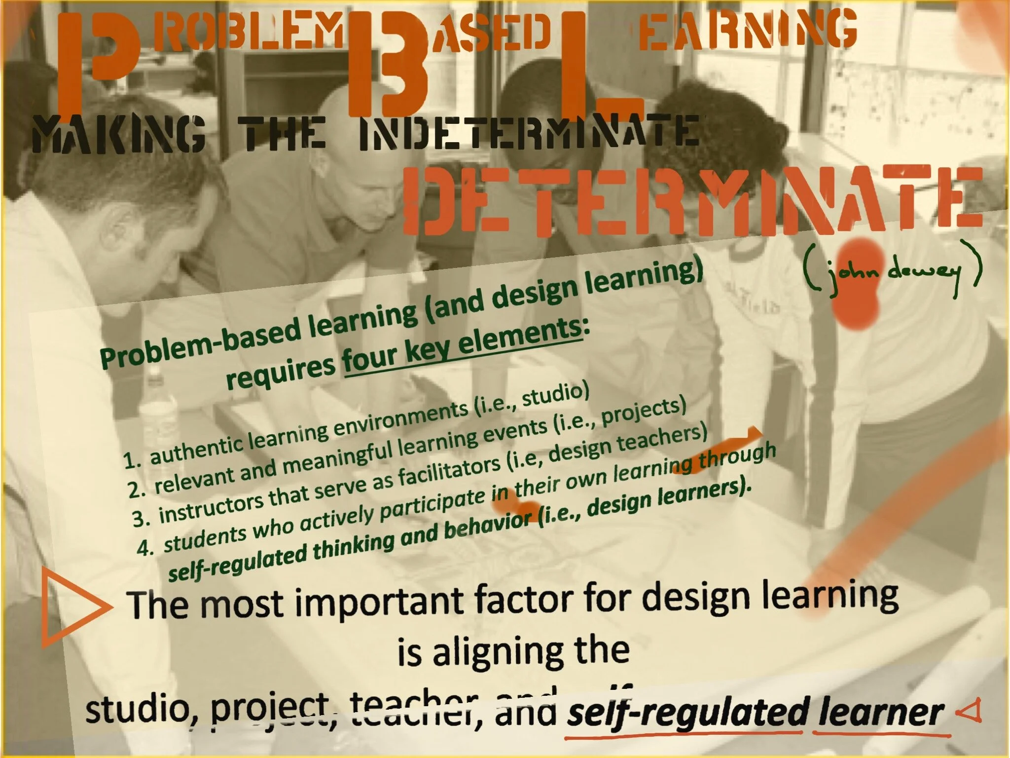 Effective PBL (and design learning) depends on four key elements including (1) authentic learning environments, (2) relevant and meaningful learning events, (3) instructors that serve as facilitators, and most importantl, (4) students that actively participate in their own learning through self-regulated thinking and behavior. Of these key elements, the most important is self-regulated learning (SRL).